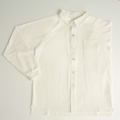 生地は綿95%/ポリウレタン5%のニットのカットソーで、伸縮抜群です。袖付けがラグラン袖ですので、腕の上げ下ろしに支障があっても、楽に袖を通せます。ボタンは天然黒蝶貝を使用。